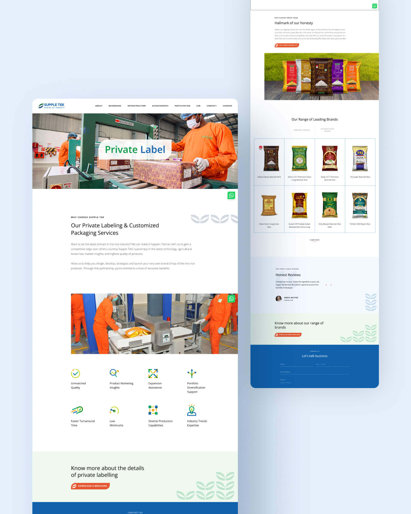 The Supple Tek brand website redesign successfully transformed their online presence, offering an immersive user experience that highlights their expertise in Indian Basmati Rice. Through intuitive navigation, captivating visuals, and informative content, the website showcases Supple Tek's commitment to quality, sustainability, and global excellence. By addressing user needs and incorporating the latest design practices, Supple Tek created a platform that engages visitors, fosters brand loyalty, and positions them as leaders in the Basmati Rice industry.